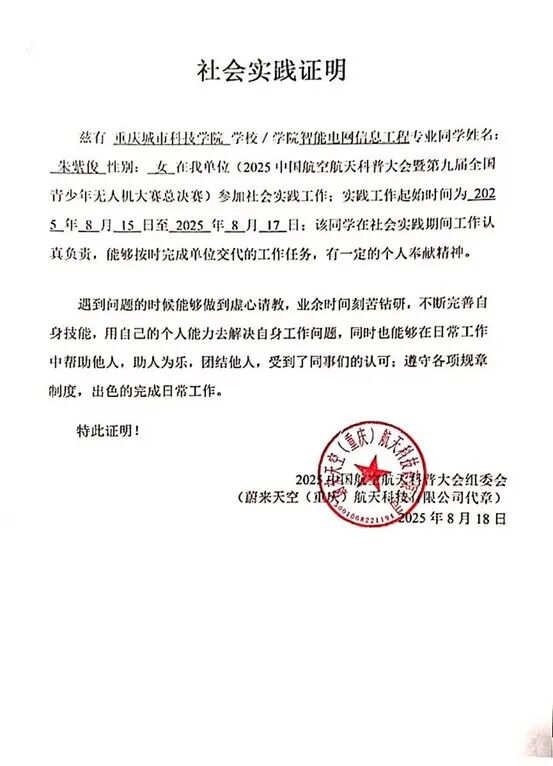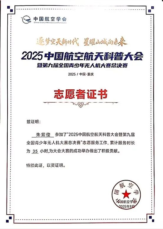 为全面贯彻习近平新时代中国特色社会主义思想,认真贯彻落实习近平总书记五四青年节对全国广大青年寄语精神,团结引领广大青年学生在与现实中“受教育、长才干、作贡献”,在奉献社会、服务群众中锤炼思想、锻炼成长,用实际行动贡献青春力量。 一、实践背景 2025年中国航空航天科普大会暨第九届全国青少年无人机大赛总决赛在重庆盛大举行。本次大会旨在普及航空航天知识,激发青少年对航空航天领域的兴趣与热爱,同时为青少年无人机爱好者提供一个展示才华、相互交流的平台。为保障大会的顺利开展,需要大量志愿者参与各项服务工作。我作为一名对航空航天领域充满好奇与热情的青年,积极投身其中,希望能为大会贡献自己的一份力量,也借此机会深入了解航空航天科普事业以及无人机相关领域的发展。 二、实践时间与地点 实践时间:2025年8月15日-2025年8月17日 实践地点:中国·重庆,2025中国航空航天科普大会暨第九届全国青少年无人机大赛总决赛场地 三、实践内容 在志愿服务期间,我主要承担了以下工作: 1.参会人员接待:负责迎接来自全国各地的参会代表、参赛选手及家长,为他们提供路线指引、会场介绍等服务,帮助他们快速熟悉大会环境,确保他们能顺利参与到大会的各项活动中。 2.赛事协助:在第九届全国青少年无人机大赛总决赛现场,协助工作人员进行赛事设备的检查与调试,确保无人机等比赛设备能正常运行。同时,在比赛过程中,协助维持现场秩序,及时为参赛选手提供必要的帮助,如传递比赛用品等。 3.科普活动支持:在航空航天科普活动区域,协助科普讲解员进行展品的展示与讲解辅助工作,帮助青少年更好地理解航空航天知识,解答他们提出的一些基础问题,激发他们对航空航天领域的探索欲望。 四、实践收获 1.知识与技能提升:通过参与大会的志愿服务,我对航空航天领域有了更深入的认识,了解到了许多前沿的航空航天知识以及无人机技术的发展现状。同时,在与不同人员的沟通交流和各项服务工作的开展中,我的沟通能力、组织协调能力以及应变能力都得到了显著提升。 2.个人品质培养:志愿服务工作需要耐心、细心和责任心。在为参会人员提供服务的过程中,我学会了更好地倾听他人需求,以更积极、热情的态度去帮助他人。遇到问题时,我能做到虚心向他人请教,不断反思自己的工作,努力提升服务质量,这也培养了我勇于担当、乐于奉献的精神。 3.社会认知拓展:这次实践让我有机会接触到来自不同地区、不同背景的人,感受到了航空航天科普事业以及青少年科技教育领域的蓬勃发展态势。我深刻认识到,志愿服务不仅是个人奉献社会的一种方式,也是个人了解社会、融入社会的重要途径,它让我对社会的多样性和发展需求有了更直观的认识。 五、实践感悟 参与2025中国航空航天科普大会的志愿服务,是一次非常有意义的经历。它让我在奉献中收获了成长与快乐,也让我更加坚定了为社会贡献力量的信念。航空航天事业是国家发展的重要领域,而青少年是未来科技发展的主力军,能为这样一场旨在推动航空航天科普和青少年科技发展的大会服务,我深感荣幸。未来,我希望能继续参与更多类似的志愿服务活动,在服务社会的同时,不断提升自我,为国家的科技事业发展贡献自己的微薄之力。 文字:朱紫俊 图片:朱紫俊 编辑:黄高涛 初审:盛一凡 终审:徐源