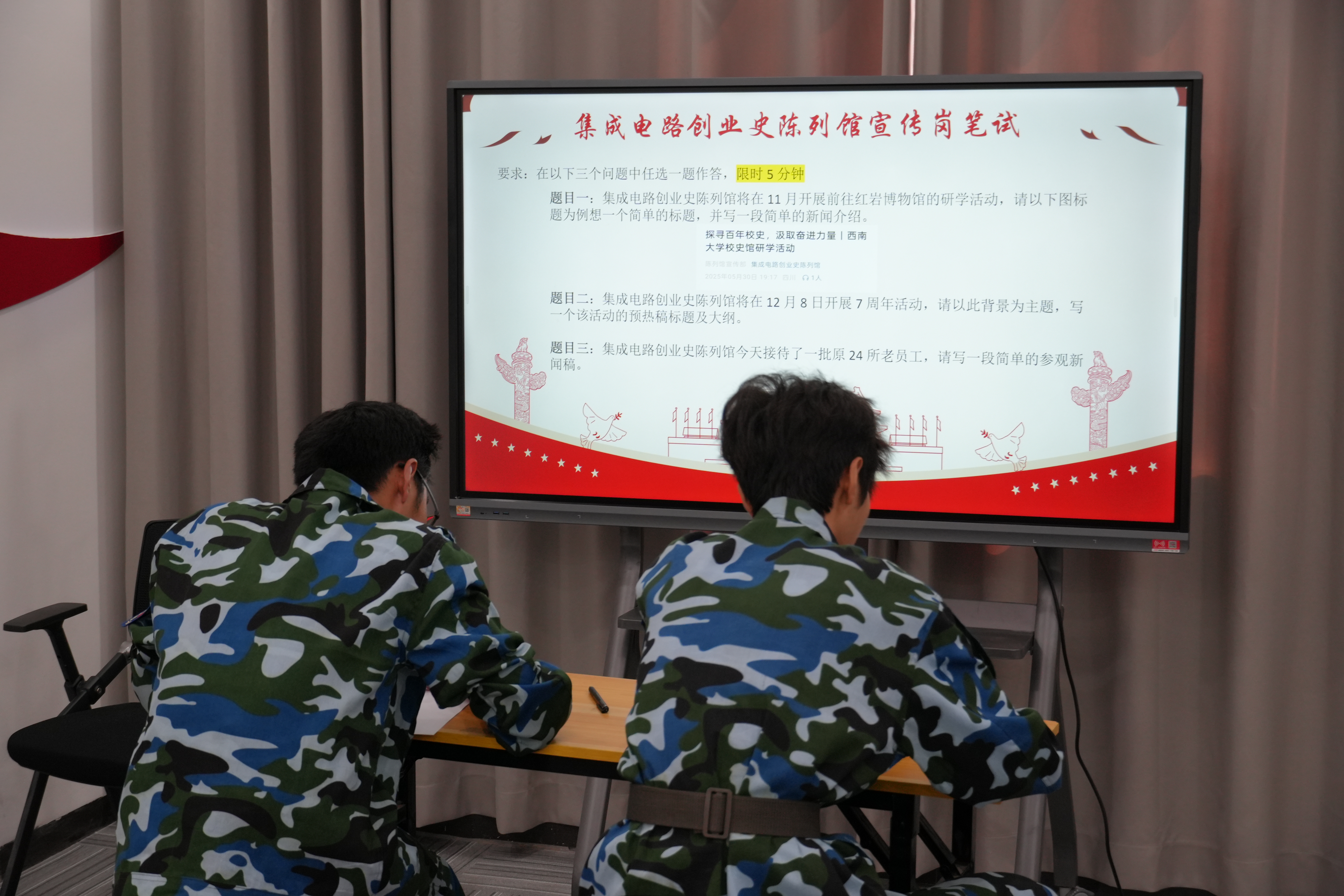 为扩充队伍、储备红色文化传播人才,集成电路创业史陈列馆于9月23日及24中午,顺利完成第八届学生公益讲解员的纳新面试工作。 9月23日中午,首轮面试在第五教学楼 203教室开展,设 “自我介绍”“现场提问” 两环节。30秒自我介绍中,考生清晰展示个人经历、特长及对讲解工作的认知;提问环节,评委围绕未来规划、展馆历史、学生工作及模拟场景提问,全面考察综合素养。多数考生准备充分、表达流畅,在历史内涵理解与情景应变上显潜力,筛选效果显著。评审组随后合议确定二轮面试名单。 (图1-6 第一轮面试) 本次面试结束后,陈列馆将重点开展新成员岗前培训,围绕红 “芯” 文化内涵、三线精神解读、讲解礼仪规范开展教学,确保新成员快速融入、胜任岗位,以专业姿态投身公益讲解,助力红色文化传承。 (图7-10 第二轮面试) 文字:周浩宇 图片:何国栋 周浩宇 编辑:黄高涛 初审:谢欣妤 终审:徐源
