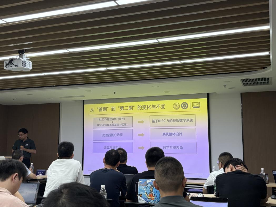 张科博士则聚焦于开源芯片设计与敏捷开发方法。他详细介绍了 RISC-V 开源芯片的设计流程与工具链,从芯片架构设计到后端实现的全流程进行了系统讲解。针对敏捷开发方法,张博士结合实际项目案例,展示了如何利用先进的设计工具与方法学,快速实现芯片原型验证与迭代优化。同时,他还分享了团队在 RISC-V 云平台开发方面的实践经验,为教师们提供了宝贵的工程参考。
