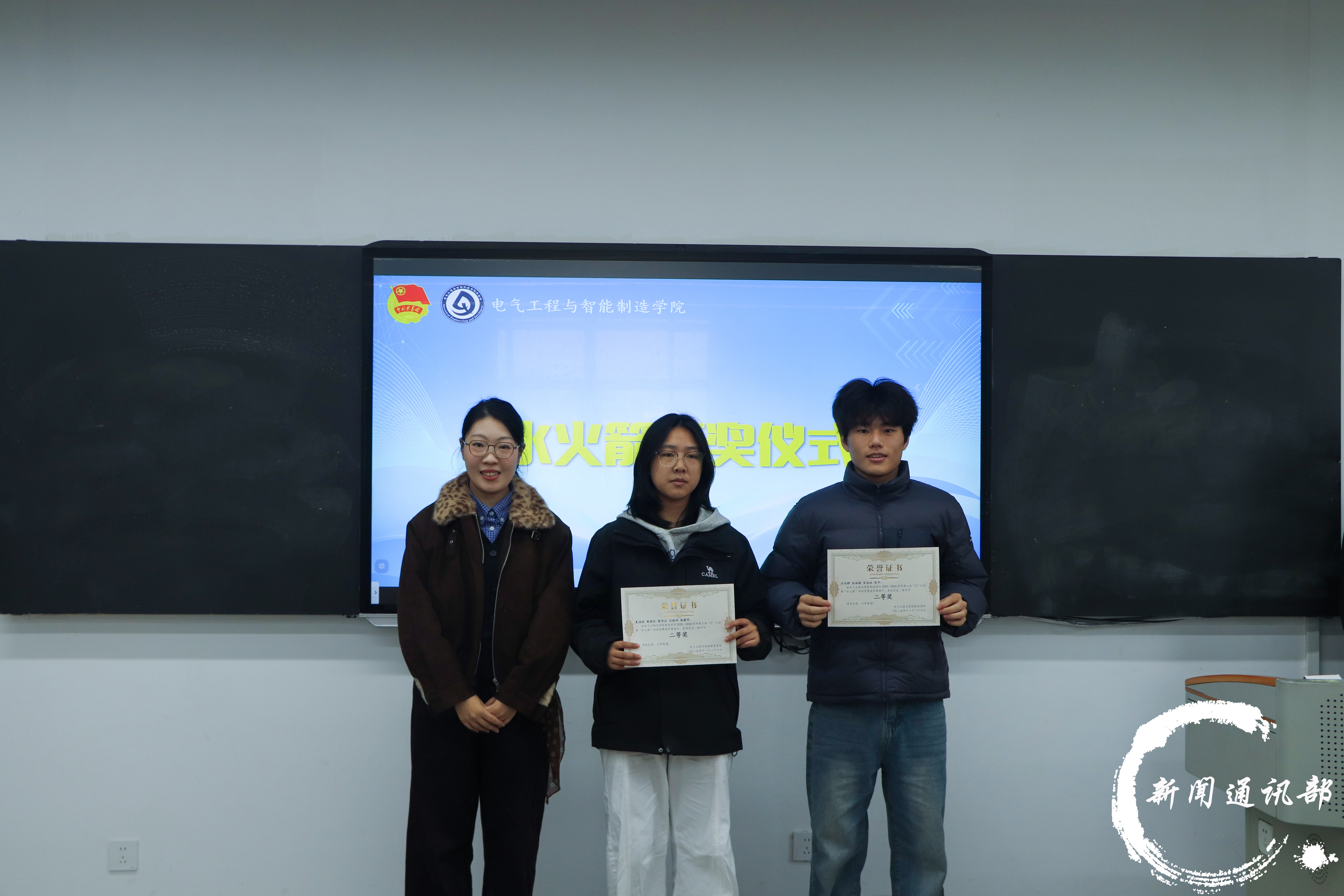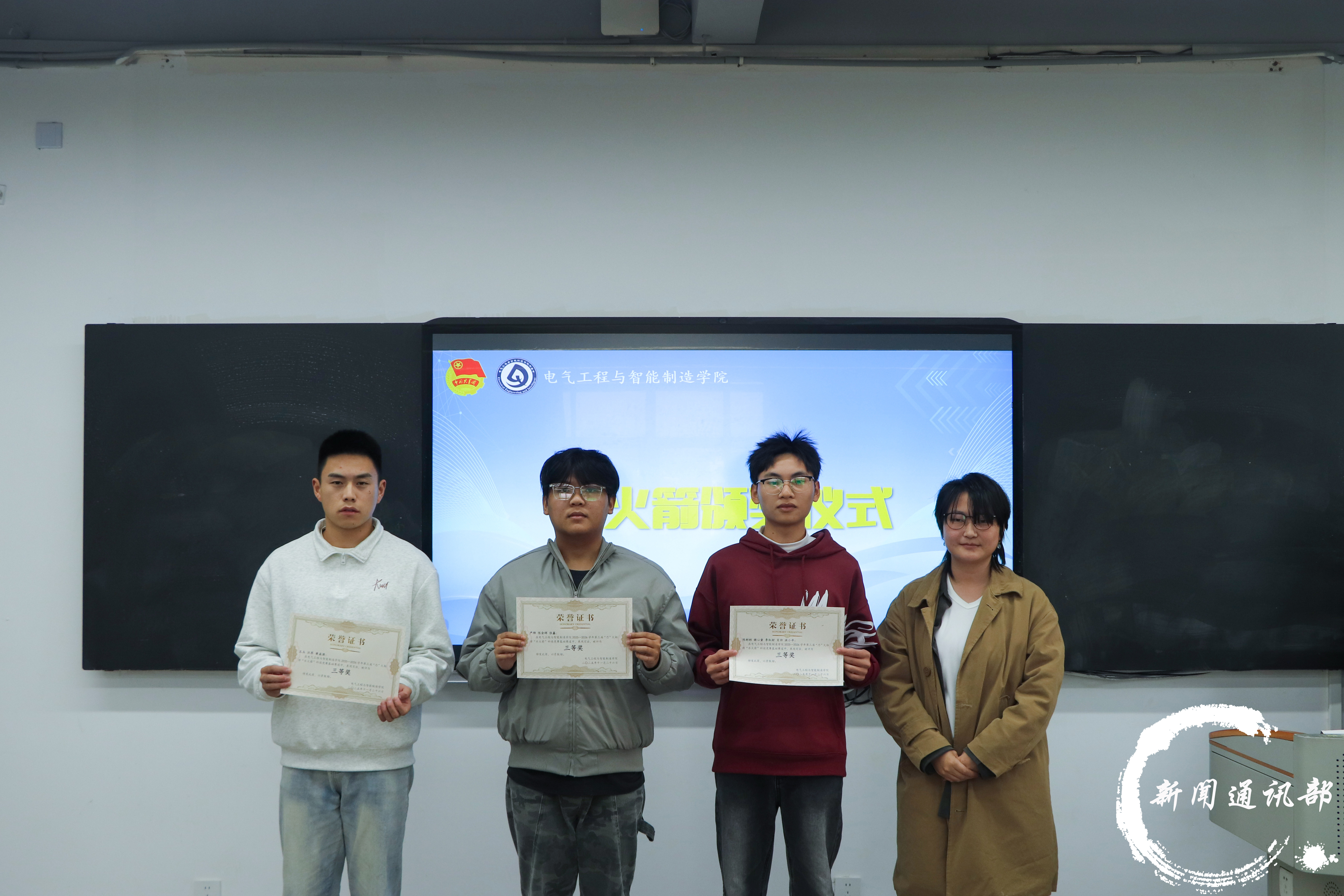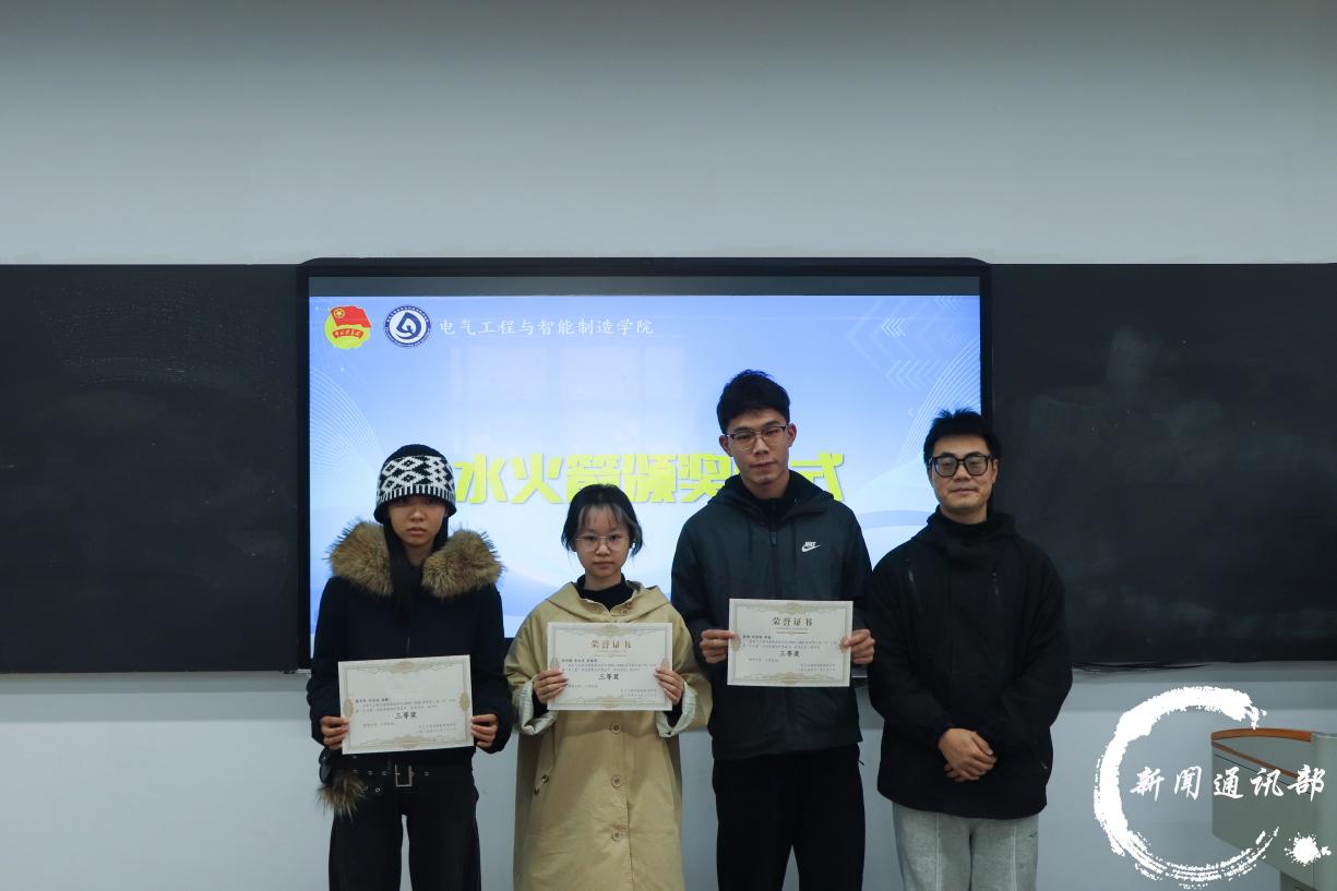 为激发大学生的创新实践能力,提升科技素养,电气工程与智能制造学院于11月26日下午四点半在第五教学楼214教室成功举办“水火箭”科技竞赛颁奖仪式。学院党总支副书记李宇、副院长张玉林、学生第二党支部书记李玲霞、团总支书记陈慧、团学指导老师田丽与刘伟,以及辅导员代表陈永华出席活动。 (主持人) (到场嘉宾) 本次“水火箭”科技竞赛自启动以来,吸引了众多同学的积极响应与参与。历经报名、制作与现场竞赛多个环节,参赛选手们在赛场上呈现了一场融合专业性与趣味性的科技盛宴,充分展现了同学们的创造潜能与动手能力,进一步弘扬了绿色、低碳、环保的科技理念。 颁奖现场,李宇书记为获一等奖获奖团队颁发奖状跟奖品,陈慧老师,李玲霞,陈永华老师分别为获二等奖、三等奖、优秀奖的团队颁奖;进阶赛道中,张玉林院长也为获一等奖的团队颁发奖状跟奖品,田丽老师,刘伟老师则分别为获二等奖、三等奖的队伍依次颁发荣誉。最后,所有到场嘉宾与获奖学生共同合影留念,定格了本次科技竞赛的精彩瞬间。 (基础赛道获奖队伍) (进阶赛道获奖队伍) 此次“水火箭”科技竞赛不仅为学生搭建了展示创新才能的舞台,更以生动实践传承了“芯”火相传的科创精神,营造了浓厚的校园科技文化氛围。活动进一步推动了科教融合与学风建设,为培养高素质、应用型人才注入源源不断的科技动能,也为学院的创新发展增添了新的活力与内涵。 (合影留念) 文字:雷明月 张湘缘 图片:祖渝恒 编辑:张兵 初审:盛一凡 终审:徐源